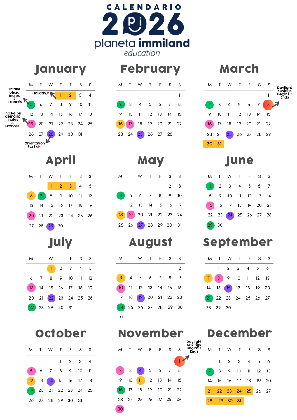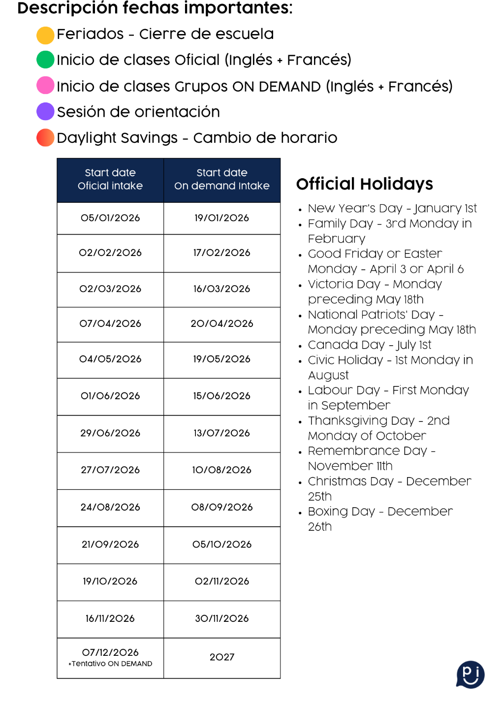 Aquí podrás observar el inicio del periodo de clases, sesión de orientación los días festivos de Canadá y períodos sin clases.